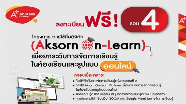 อบรมออนไลน์ฟรี!! “การใช้สื่อดิจิทัล (Aksorn On-Learn) เพื่อยกระดับการจัดการเรียนรู้ในห้องเรียนและรูปแบบออนไลน์” รับเกียรติบัตร 3 ชั่วโมง จากอักษรเจริญทัศน์