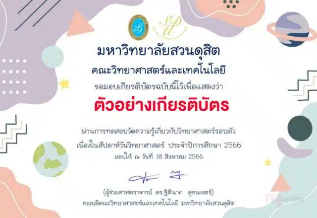 กิจกรรมการแก้ปัญหาทางคณิตศาสตร์ MATH Challenge ในงานสัปดาห์วิทยาศาสตร์ส่วนภูมิภาค ผ่านการทดสอบร้อยละ 60 รับเกียรติบัตรทางอีเมล โดยมหาวิทยาลัยสวนดุสิต