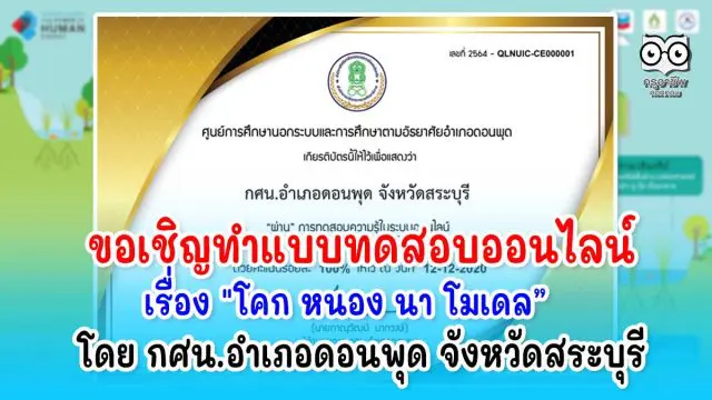 กิจกรรมทดสอบออนไลน์ ในปีงบประมาณ 2564 เรื่องที่ 3 ของ กศน.อำเภอดอนพุด จังหวัดสระบุรี เรื่อง ความรู้เบื้องต้นเกี่ยวกับ โคก หนอง นา โมเดล เพื่อการพัฒนาที่ยั่งยืน แบบทดสอบจำนวน 15 ข้อ ทำถูก 12 ข้อ ขึ้นไป รับเกีบรติบัตร