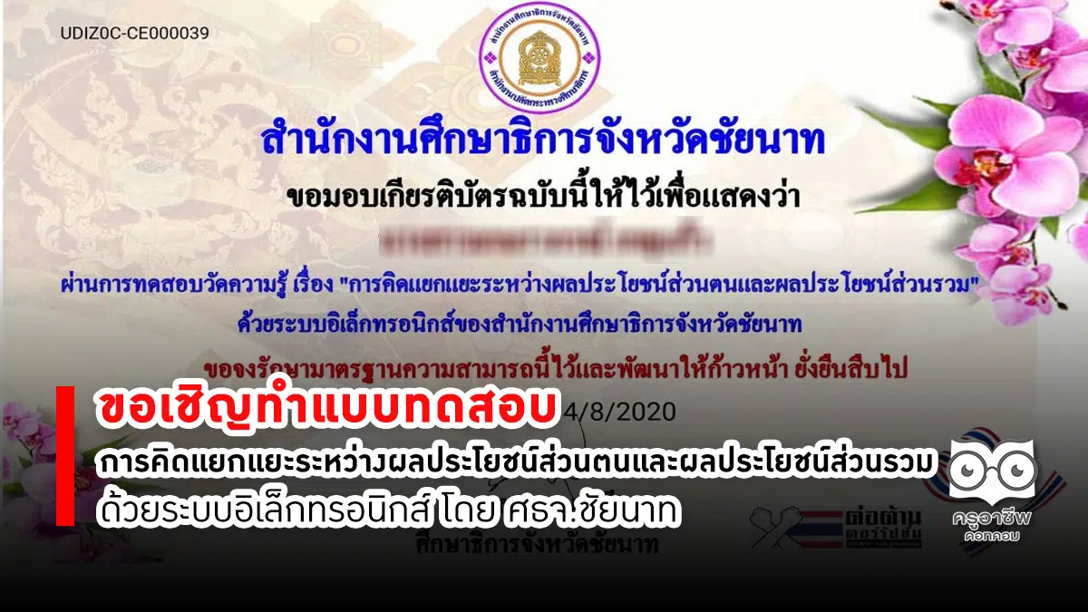 ขอเชิญทำแบบทดสอบ “การคิดแยกแยะระหว่างผลประโยชน์ส่วนตนและผลประโยชน์ส่วนรวม”ด้วยระบบอิเล็กทรอนิกส์ โดย ศธจ.ชัยนาท