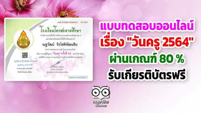 ขอเชิญทำแบบทดสอบ เรื่อง “วันครู 2564” ผ่านเกณฑ์ 80 % รับเกียรติบัตรฟรี โดยโรงเรียนโคกสะอาดศึกษา ข้อสอบจำนวน 10 ข้อ ผู้สอบผ่านเกณฑ์ 80 % จะได้รับเกียรติบัตร สำหรับท่านใดสนใจรับเกียรติบัตร คลิกได้ที่ลิ้งค์ด้านล่างครับ