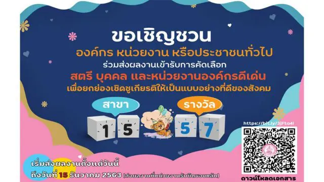 ขอเชิญร่วมส่งผลงานเข้ารับการคัดเลือก สตรี บุคคล หรือองค์กรดีเด่น วันสตรีสากล ปี 2564 ส่งผลงานภายใน 15 ธันวาคม 2563
