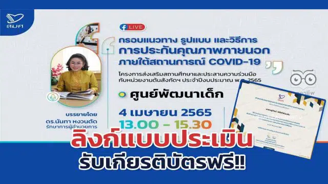 ลิงก์แบบประเมิน รับเกียรติบัตร กรอบแนวทาง รูปแบบ และวิธีการประกันคุณภาพภายนอกภายใต้สถานการณ์ COVID-19 ศูนย์พัฒนาเด็ก วันที่ 4 เมษายน 2565 รับเกียรติบัตรฟรี โดย สมศ.