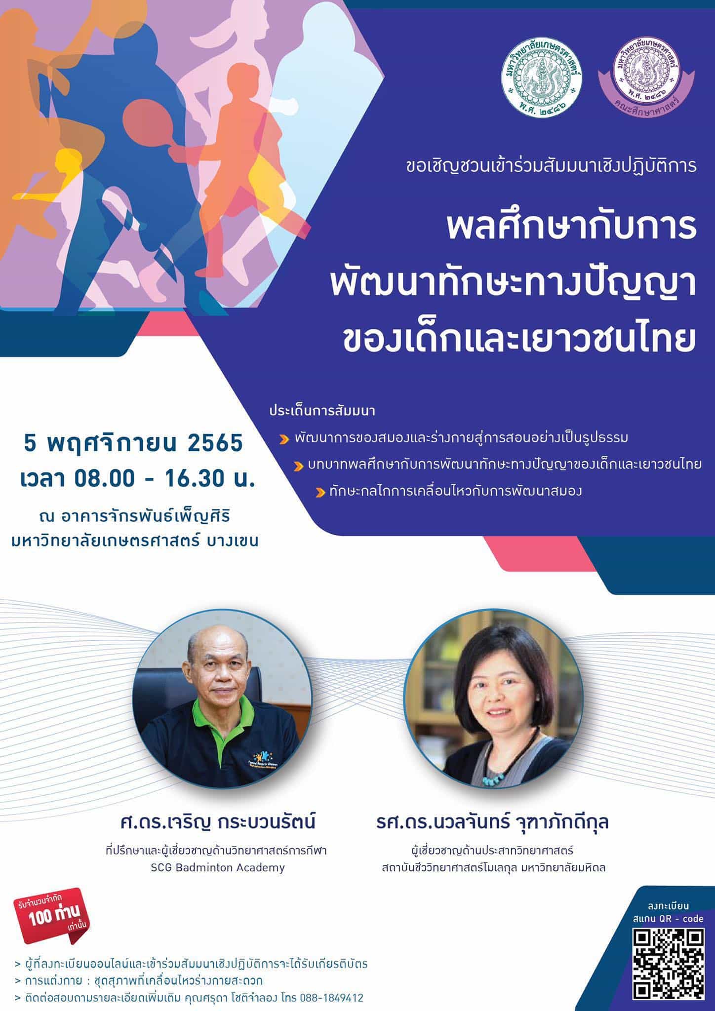 ขอเชิญลงทะเบียนร่วมสัมมนาเชิงปฏิบัติการ หัวข้อ “พลศึกษากับการพัฒนาทักษะทางปัญญาของเด็กและเยาวชนไทย” วันเสาร์ที่ 5 พฤศจิกายน พ.ศ. 2565 เวลา 08.00 – 16.30 น. รับเกียรติบัตร ฟรี โดยภาควิชาพลศึกษา คณะศึกษาศาสตร์ มหาวิทยาลัยเกษตรศาสตร์