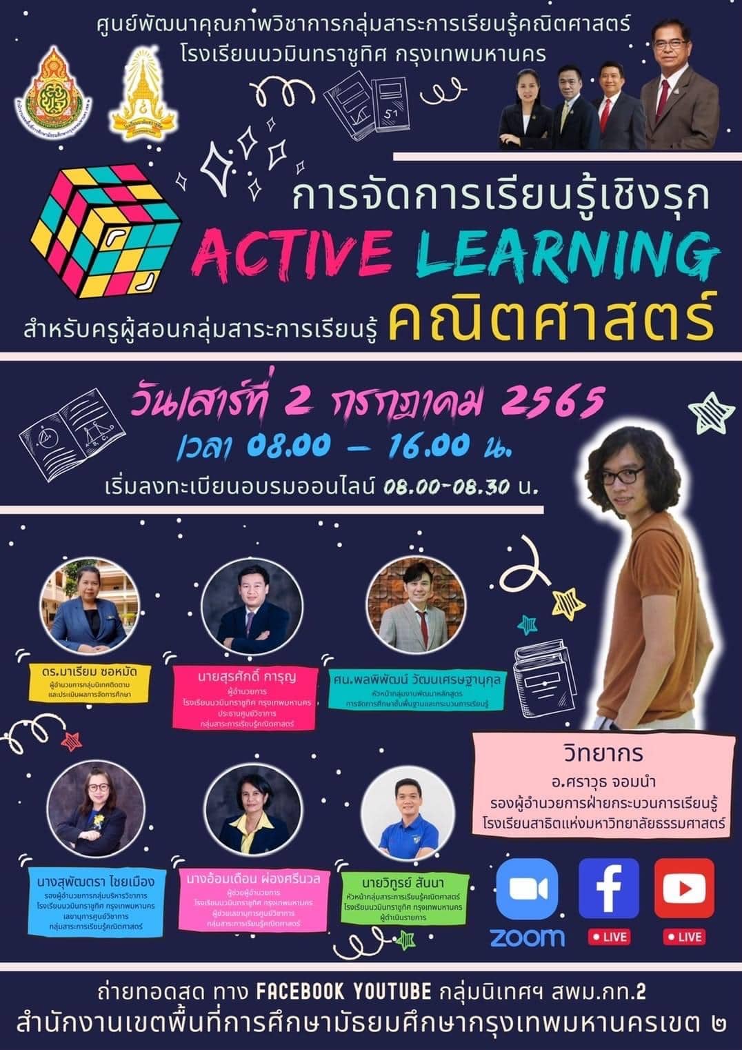 ขอเชิญอบรมออนไลน์ เรื่อง การจัดการเรียนรู้เชิงรุก Active Learning สำหรับครูผู้สอนคณิตศาสตร์ วันที่ 2 กรกฎาคม 2565 โดย โรงเรียนนวมินทราชูทิศ กรุงเทพมหานคร ร่วมกับ สพม.กท.2