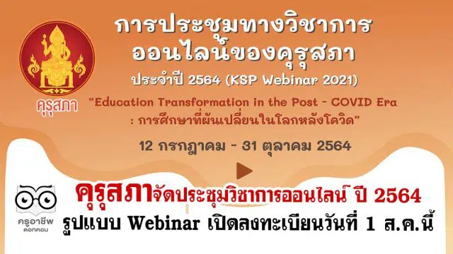 สำนักงานเลขาธิการคุรุสภา ร่วมกับ หน่วยงานด้านการศึกษา ราชวิทยาลัย มหาวิทยาลัย และองค์การบริหารส่วนตำบล ทั้งหน่วยงานภาครัฐ และภาคเอกชนรวม 11 หน่วยงาน กำลังจัดประชุมทางวิชาการออนไลน์ของคุรุสภา ประจำปี 2564 (KSP Webinar 2021) ภายใต้ theme “Education Transformation in the Post-COVID Era” หรือ “การศึกษาที่ผันเปลี่ยนในโลกหลังโควิด” เพื่อเป็นเวทีสำหรับการแลกเปลี่ยนเรียนรู้องค์ความรู้ทางวิชาการและวิชาชีพทางด้านการศึกษาที่ผันเปลี่ยนไปในโลก หลังเกิดเหตุการณ์แพร่ระบาดของโรคติดเชื้อไวรัสโคโรนา 2019 (โควิด-19) การสร้าง การใช้ และการเผยแพร่ผลงานวิจัยของผู้ประกอบวิชาชีพทางการศึกษา และผลงานนวัตกรรมของสถานศึกษา โดยใช้วิธีการประชุมสัมมนาออนไลน์ในรูปแบบ Webinar (Web-based-seminar) ซึ่งเป็นการแลกเปลี่ยนเรียนรู้ระหว่างวิทยากรและผู้เข้าร่วม ผ่านช่องทางออนไลน์ทั้งหมด สอดคล้องกับสถานการณ์การแพร่ระบาดของ โควิด-19 ในขณะนี้