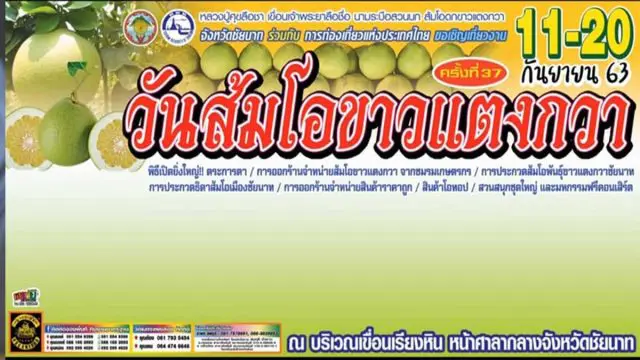 จึงขอเชิญชวนประชาชนชาวจังหวัดชัยนาทและจังหวัดใกล้เคียง ตลอดจนนักท่องเที่ยวทุกท่าน มาร่วมเที่ยวงาน ส้มโอขาวแตงกวาจังหวัดชัยนาท และของดีศรีท้องถิ่น ครั้งที่ 37 ประจำปี 2563 ระหว่างวันที่ 11 – 20 กันยายน 2563 ณ บริเวณเขื่อนเรียงหิน หน้าศาลากลางจังหวัดชัยนาท
