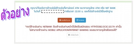 กรณีชำระเงินผ่าน NETBANK ต้องชำระเงินผ่านหน้าเว็บไซต์รับสมัครสอบ http://job2.ocsc.go.th เท่านั้น ไม่สามารถชำระเงินผ่าน Mobile Application / Internet Banking ของธนาคารกรุงไทยโดยตรงได้เมื่อชำระเงินแล้วให้ผู้สมัครสอบ ตรวจสอบหลักฐานการชำระเงินว่าเข้าบัญชีเงินฝาก “สำนักงานคณะกรรมการข้าราชการพลเรือน” หรือไม่ หากไม่ถูกต้องโปรดแจ้งให้ธนาคารแก้ไขทันที(หากแก้ไขภายหลังอาจจะไม่ได้รอบสอบตามที่ต้องการ กรณีที่ธนาคารดำเนินการถูกต้องแล้ว ไม่สามารถแก้ไขได้)