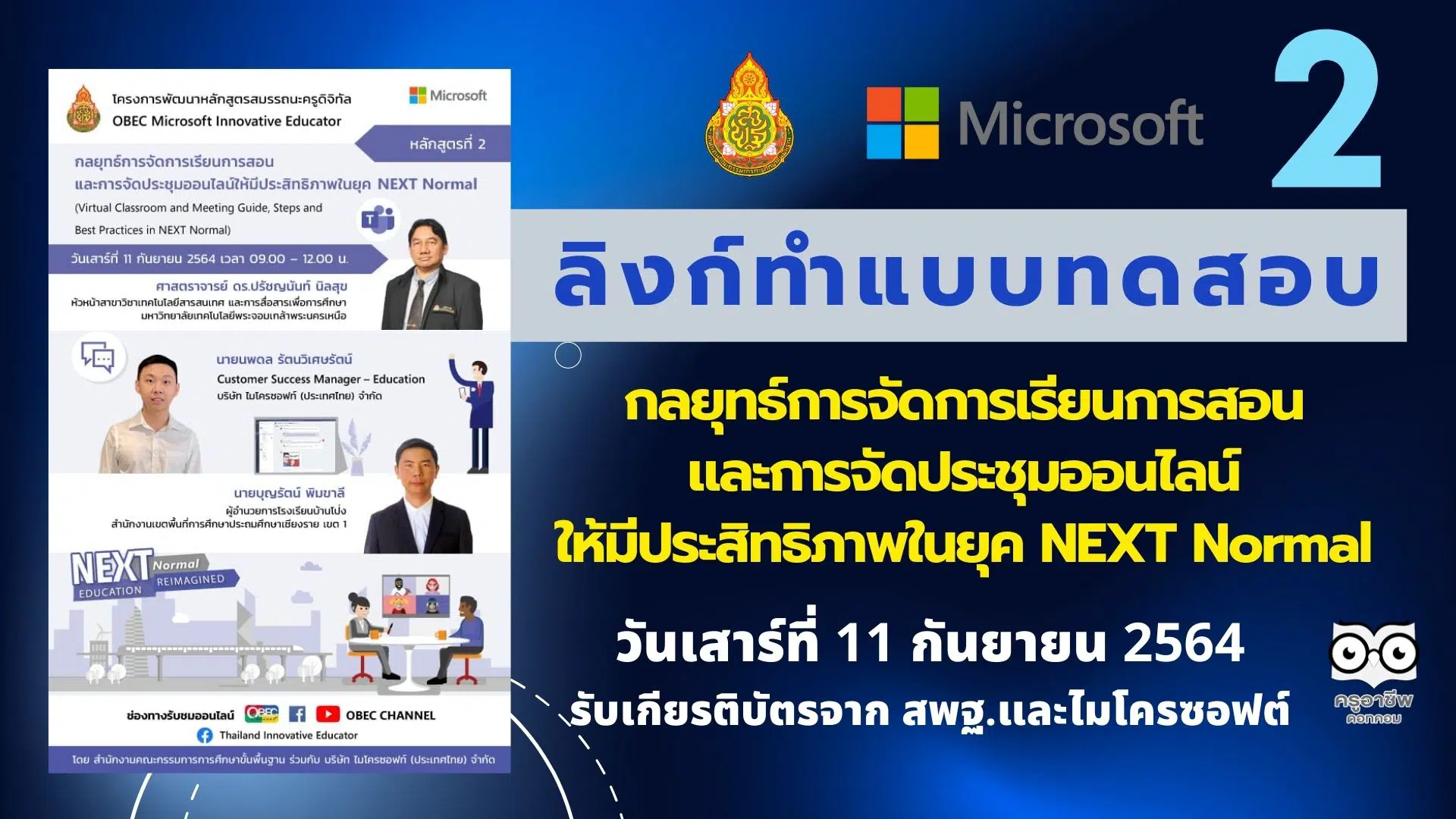 ลิงก์ทำแบบทดสอบ หลักสูตรที่ 2 กลยุทธ์การจัดการเรียนการสอน และการจัดประชุมออนไลน์ให้มีประสิทธิภาพในยุค NEXT Normal วันเสาร์ที่ 11 กันยายน 2564 เวลา 9:00-12:00 น. รับเกียรติบัตรจาก สพฐ.และไมโครซอฟต์