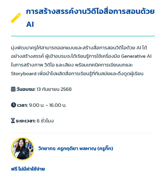 ลงทะเบียนอบรมออนไลน์ฟรี หลักสูตรเสริมพลังครูสร้างนวัตกรรมสื่อการสอนด้วย AI 2 หลักสูตร รับเกียรติบัตรฟรีจากกระทรวงศึกษาธิการ