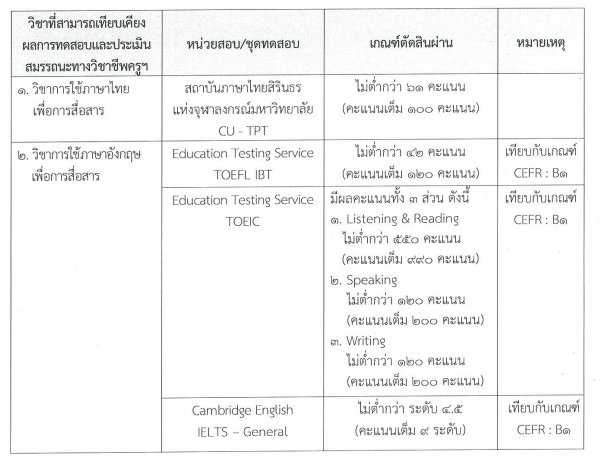 โดยเกณฑ์ระดับหรือผลคะแนนการสอบ จากหน่วยสอบและชุดทดสอบมาตรฐาน ที่สามารถยื่นขอเทียบเคียงผลการทดสอบและประเมินสมรรถะทางวิชาชีพครู ด้านความรู้และประสบการณ์วิชาชีพตามมาตรฐานวิชาชีพครู ได้ในแต่ละวิชา มีดังนี้