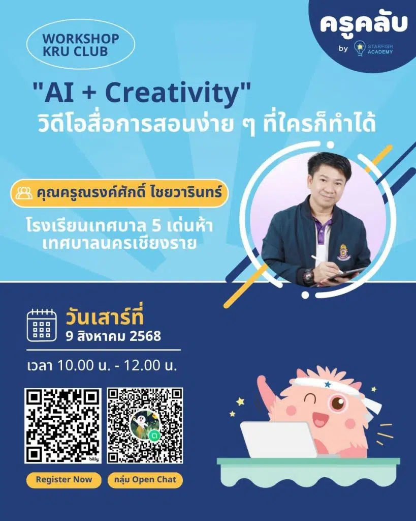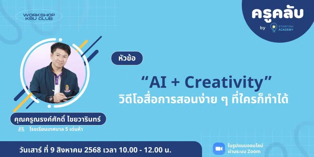 อบรมออนไลน์ฟรี AI + Creativity : วิดีโอสื่อการสอนง่าย ๆ ที่ใครก็ทำได้ วันที่ 9 สิงหาคม 2568 รับเกียรติบัตรจาก Starfish Labz