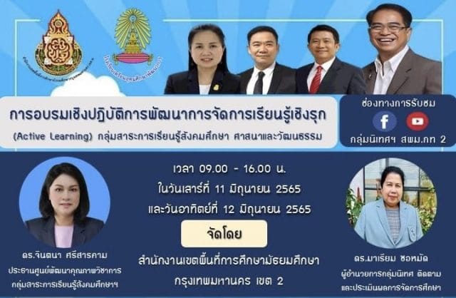 ขอเชิญอบรมออนไลน์ การพัฒนาการจัดการเรียนรู้เชิงรุก (Active Learning) กลุ่มสาระการเรียนรู้สังคมศึกษา ศาสนาและวัฒนธรรม วันที่ 11-12 มิถุนายน 2565 รับเกียรติบัตรฟรี โดย สพม.กท.2