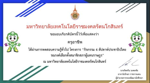 แบบทดสอบออนไลน์ ความรู้ทั่วไป การเลือกตั้งสมาชิกสภาผู้แทนราษฎร ผ่านเกณฑ์ รับเกียรติบัตรทางอีเมล โดยมหาวิทยาลัยเทคโนโลยีราชมงคลรัตนโกสินทร์