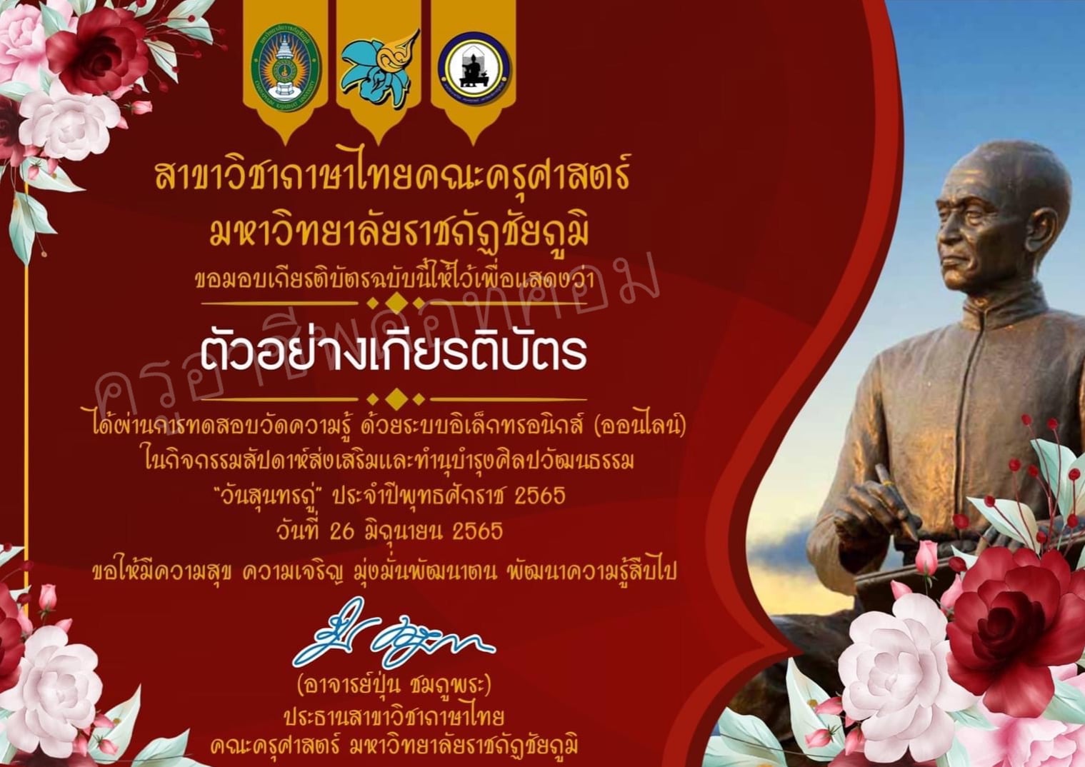 แบบทดสอบออนไลน์ เนื่องใน วันสุนทรภู่ ประจำปี พ.ศ. 2565 ผ่านเกณฑ์ รับเกียรติบัตรทางอีเมล โดยมหาวิทยาลัยราชภัฏชัยภูมิ