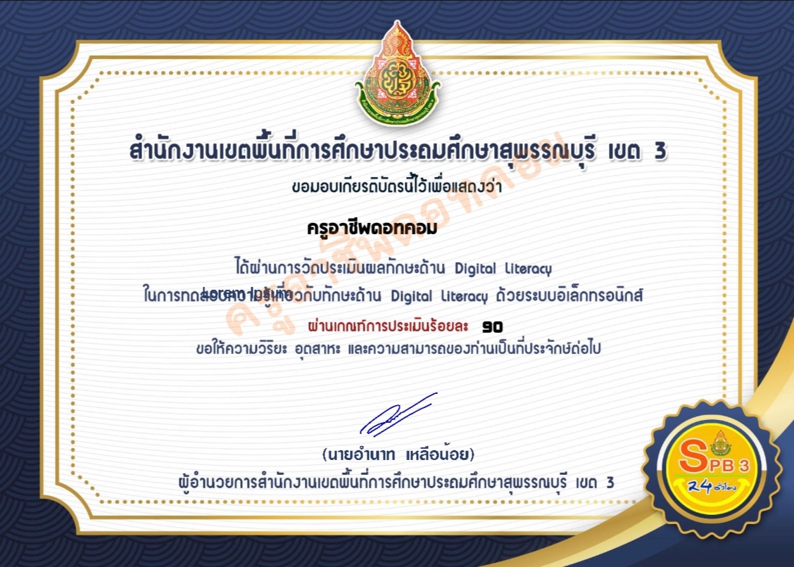 ครูอาชีพดอทคอม ขอแนะนำแบบทดสอบออนไลน์ฟรี สามารถดาวน์โหลดเกียรติบัตรได้ทันที เมื่อสอบผ่านเกณฑ์ ในโครงการการวัดความรู้ ความเข้าใจ เรื่องการวัดประเมินผลทักษะด้านการเข้าใจดิจิทัล (Digital Literacy) โดยสำนักงานเขตพื้นที่การศึกษาประถมศึกษาสุพรรณบุรี เขต 3 โปรดตรวจสอบให้ถูกต้องก่อนส่งแบบทดสอบ
