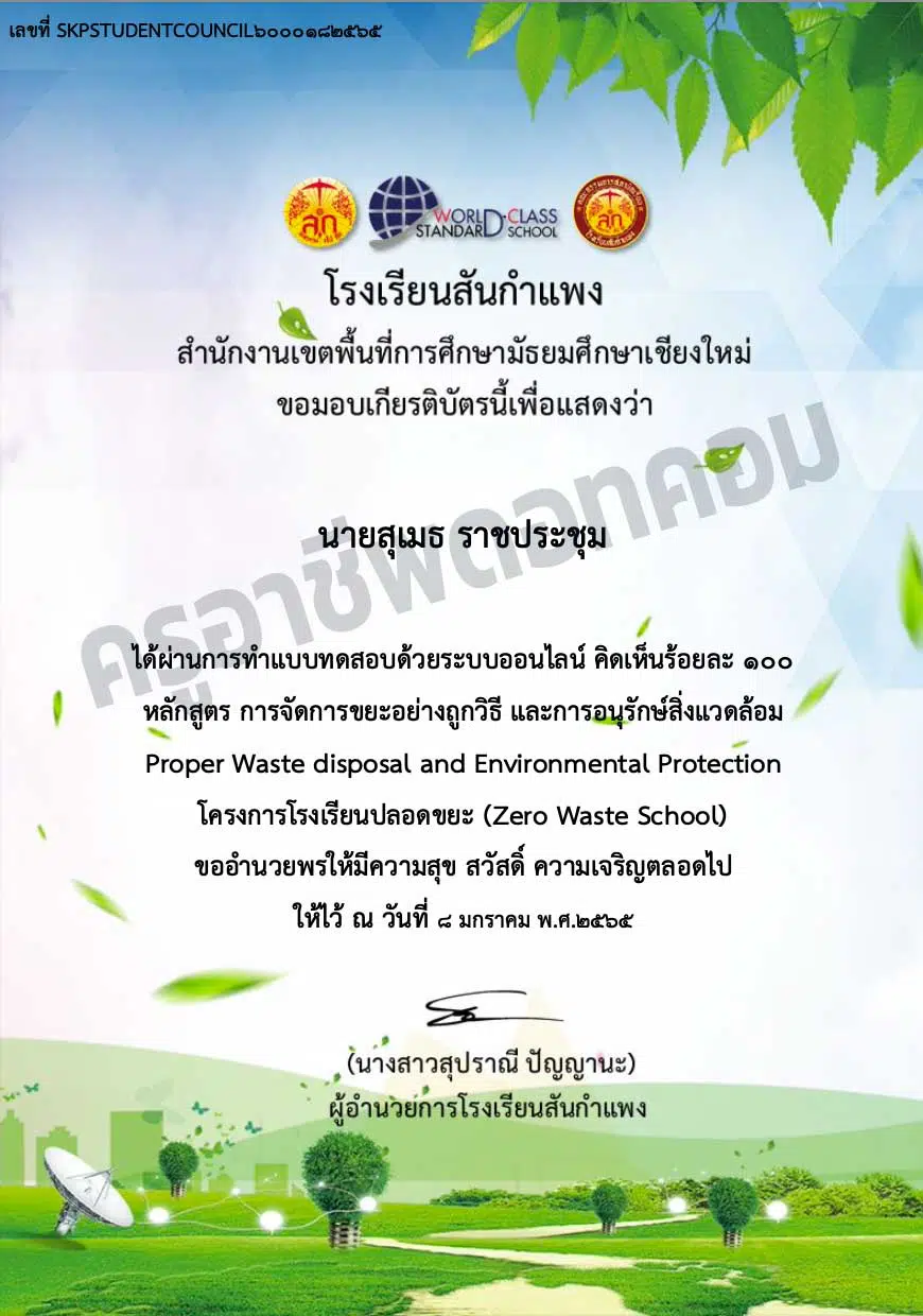 แบบทดสอบ หลักสูตร การจัดการขยะอย่างถูกวิธี และการอนุรักษ์สิ่งแวดล้อม Proper Waste disposal and Environmental Protection โครงการโรงเรียนปลอดขยะ (Zero Waste School) โดยโรงเรียนสันกำแพง จังหวัดเชียงใหม่