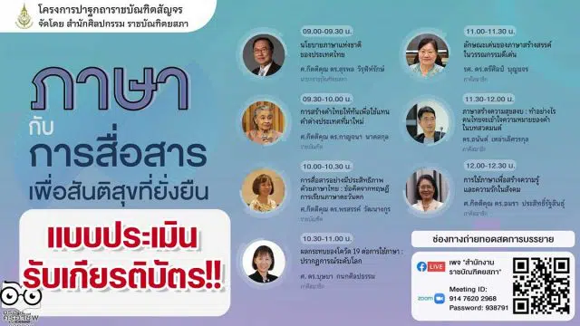 โครงการปาฐกถาราชบัณฑิตสัญจรเรื่อง ภาษากับการสื่อสารเพื่อสันติสุขที่ยั่งยืนการบรรยายออนไลน์จัดโดย สำนักศิลปกรรม ประเภทวิชาวรรณศิลป์ ราชบัณฑิตยสภาวันอังคารที่ ๒๔ สิงหาคม พ.ศ. ๒๕๖๔ เวลา ๙.๐๐-๑๓.๐๐ น.