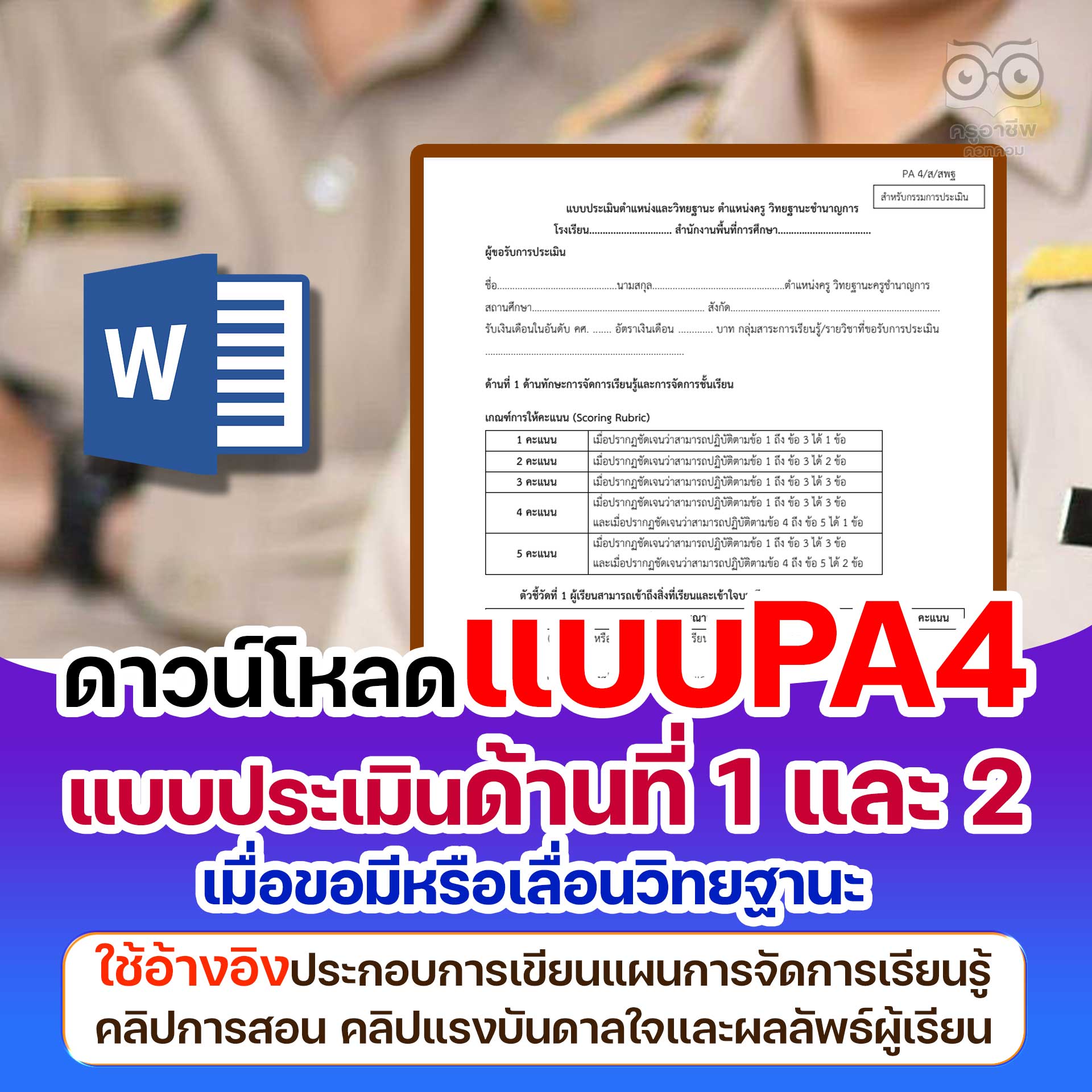 บทความนี้ ครูอาชีพดอทคอม ขอนำเสนอ แบบฟอร์ม PA4 แบบประเมินด้านที่ 1 และ 2 เมื่อขอมีหรือเลื่อนวิทยฐานะ ใช้อ้างอิงประกอบการเขียนแผนการจัดการเรียนรู้ คลิปการสอน คลิปแรงบันดาลใจ ผลลัพธ์การเรียนรู้ของผู้เรียน