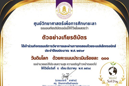 แบบทดสอบออนไลน์ เรื่อง วันดินโลก ประจำปี 2568 ผ่านเกณฑ์ 60% รับเกียรติบัตรทางอีเมล โดยศูนย์วิทยาศาสตร์เพื่อการศึกษายะลา