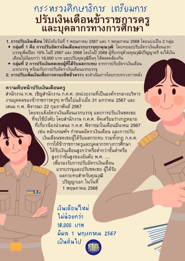 การปรับเงินเดือนครู เงินเดือนใหม่ ไม่น้อยกว่า 18,000 บาท มีผล 1 พ.ค. 2567