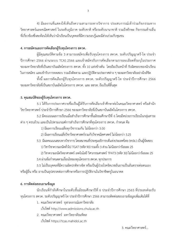 ประกาศสถาบันส่งเสริมการสอนวิทยาศาสตร์และเทคโนโลยี เรื่อง การคัดเลือกผู้รับทุนโครงการส่งเสริใการผลิตครูที่มีความสามารถพิเศษทางวิทยาศาสตร์และคณิตศาสตร์ (ทุนโครงการ สควค.) ระยะที่ 4 ระดับปริญญาตรี – โท ทุน สควค 66 ประจำปีการศึกษา 2566