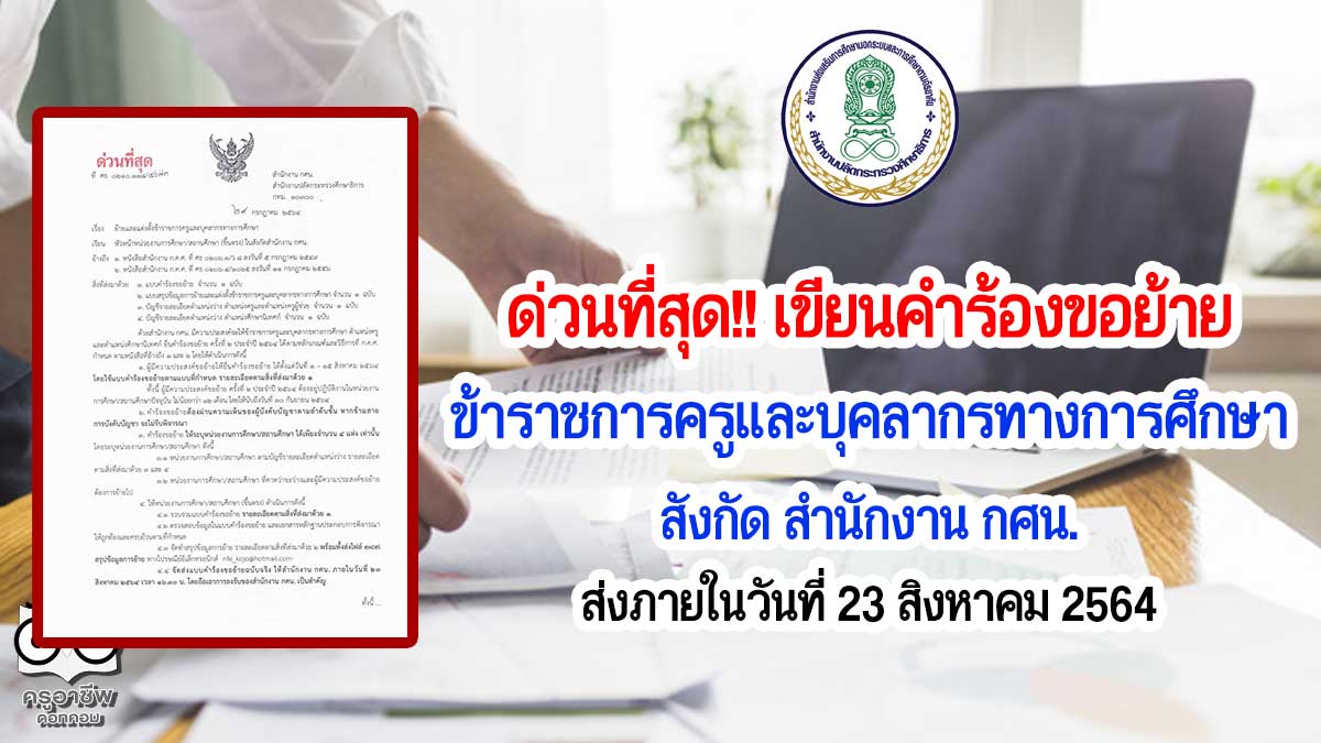 ด่วนที่สุด เขียนคำร้องขอย้ายข้าราชการครูและบุคลากรทางการศึกษา สังกัด สำนักงาน กศน. ส่งภายในวันที่ 23 สิงหาคม 2564