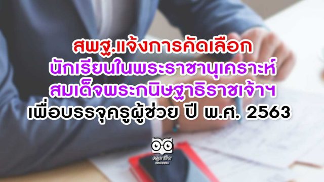สพฐ.แจ้งการคัดเลือกนักเรียนในพระราชานุเคราะห์สมเด็จพระกนิษฐาธิราชเจ้าฯ เพื่อบรรจุครูผู้ช่วย ปี พ.ศ. 2563 การคัดเลือกผู้เป็นนักเรียนในพระราชานุเคราะห์สมเด็จพระกนิษฐาธิราชเจ้า กรมสมเด็จพระเทพรัตนราชสุดาฯ สยามบรมราชกุมารีเพื่อบรรจุและแต่งตั้งเป็นข้าราชการครูและบุคลากรทางการศึกษา ตำแหน่งครูผู้ช่วย ปี พ.ศ. 2563