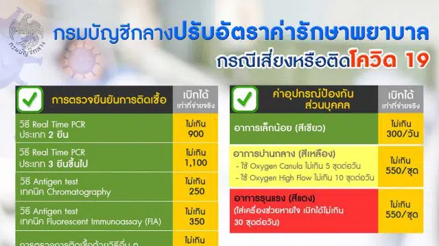 1.1 การตรวจยืนยันการติดเชื้อด้วยวิธี Real Time PCR โดยการทำป้ายหลังโพรงจมูกและลำคอ ประเภท 2 ยีน ให้เบิกได้เท่าที่จ่ายจริงไม่เกิน 900 บาท จากเดิม 1,300 บาท