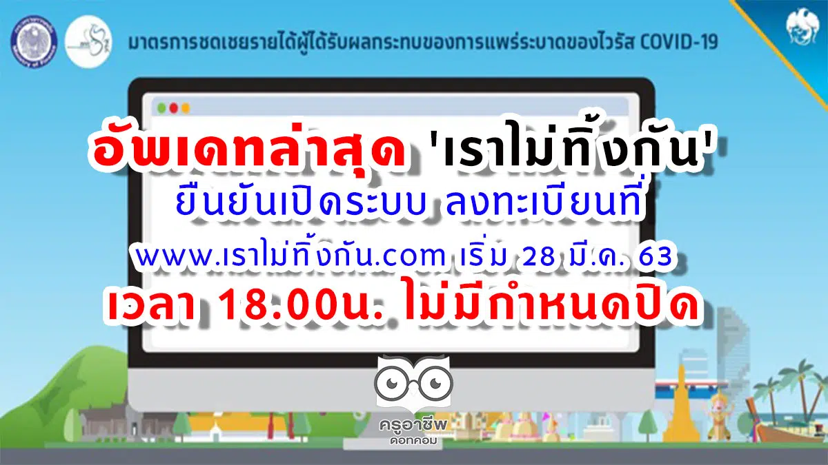 อัพเดทล่าสุด ‘เราไม่ทิ้งกัน’ ยืนยันเปิดระบบลงทะเบียนที่ www.เราไม่ทิ้งกัน.com เริ่ม 28 มี.ค. 63 เวลา 18.00น. ไม่มีกำหนดปิด ช่องทางรับเงินบัญชีธนาคารใดก็ได้ หรือผ่านพร้อมเพย์ผูกกับบัตรประชาชน