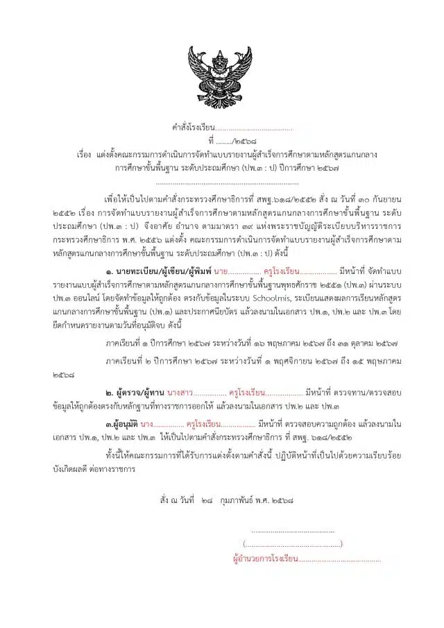 เพื่อให้เป็นไปตามคำสั่งกระทรวงศึกษาธิการที่ สพฐ.618/2552 สั่ง ณ วันที่ 30 กันยายน 2552 เรื่อง การจัดทำแบบรายงานผู้สำเร็จการศึกษาตามหลักสูตรแกนกลางการศึกษาขั้นพื้นฐาน ระดับประถมศึกษา (ปพ.3 : ป) จึงอาศัย อำนาจ ตามมาตรา 39 แห่งพระราชบัญญัติระเบียบบริหารราชการกระทรวงศึกษาธิการ พ.ศ. 2556 แต่งตั้ง คณะกรรมการดำเนินการจัดทำแบบรายงานผู้สำเร็จการศึกษาตามหลักสูตรแกนกลางการศึกษาขั้นพื้นฐาน ระดับประถมศึกษา (ปพ.3 : ป) ดังนี้
