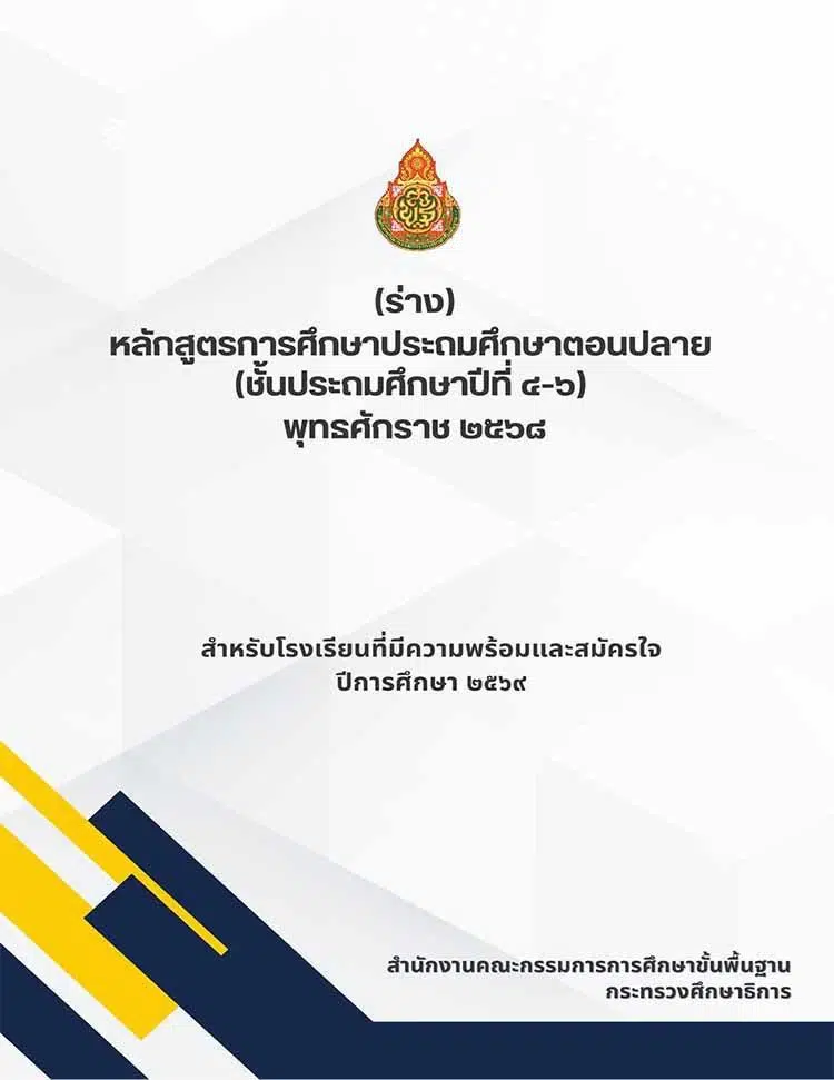 สพฐ.เผยแพร่ หลักสูตรการศึกษาประถมศึกษาตอนปลาย (ชั้นประถมศึกษาปีที่ 4-6) พุทธศักราช 2568 (ฉบับร่าง) หลักสูตรการศึกษาประถมศึกษาตอนปลาย (ชั้นประถมศึกษาปีที่ ๔-๖) พุทธศักราช ๒๕๖๘ สำหรับโรงเรียนที่มีความพร้อมและสมัครใจ ปีการศึกษา ๒๕๖๙