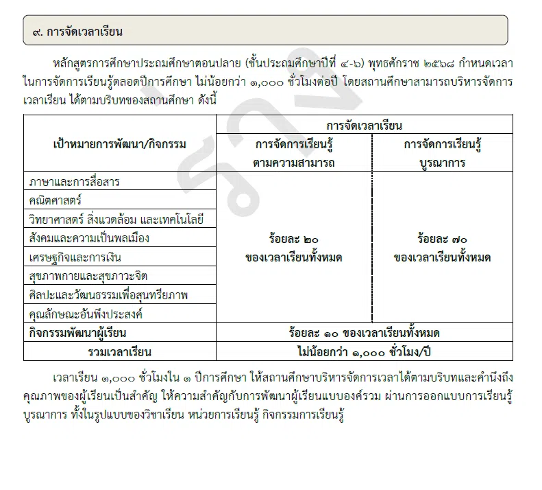 ในการจัดการเรียนรู้ตลอดปีการศึกษา ไม่น้อยกว่า ๑,๐๐๐ ชั่วโมงต่อปี โดยสถานศึกษาสามารถบริหารจัดการ