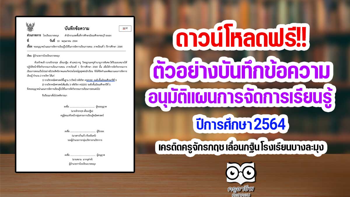 บทความนี้ ครูอาชีพดอทคอม ขอนำเสนอตัวอย่างบันทึกข้อความอนุมัติ แผนการจัดการเรียนรู้ ปีการศึกษา 2564 เป็นตัวอย่างแนวทางในการเตรียมหน่วยการเรียนรู้และแผนการจัดการเรียนรู้ของ 1/2564 ให้พร้อมและเสนอขออนุมัติการใช้ ขอขอบคุณตัวอย่างไฟล์จาก ครูจักรกฤช เลื่อนกฐิน ครูชำนาญการพิเศษ โรงเรียนบางละมุง และ Facebook ศูนย์พัฒนาวิชาชีพครูโรงเรียนบางละมุง
