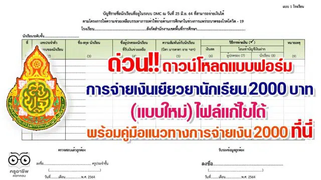 ด่วน!! ดาวน์โหลดแบบฟอร์ม การจ่ายเงินเยียวยานักเรียน 2000 บาท (แบบใหม่) ไฟล์แก้ไขได้ พร้อมคู่มือแนวทางการจ่ายเงิน 2000 ที่นี่