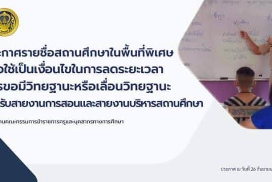 ประกาศรายชื่อสถานศึกษาในพื้นที่พิเศษเพื่อใช้เป็นเงื่อนไขในการลดระยะเวลาการขอมีวิทยฐานะหรือเลื่อนวิทยฐานะ สำหรับสายงานการสอนและสายงานบริหารสถานศึกษา