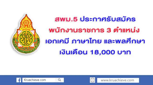 สพม.5 ประกาศรับสมัครพนักงานราชการ จำนวน 3 อัตรา วิชาเอกเคมี ภาษาไทย และ พลศึกษา เปิดรับสมัคร 7-15 พ.ย. 2562 โดยมีรายละเอียดดังนี้