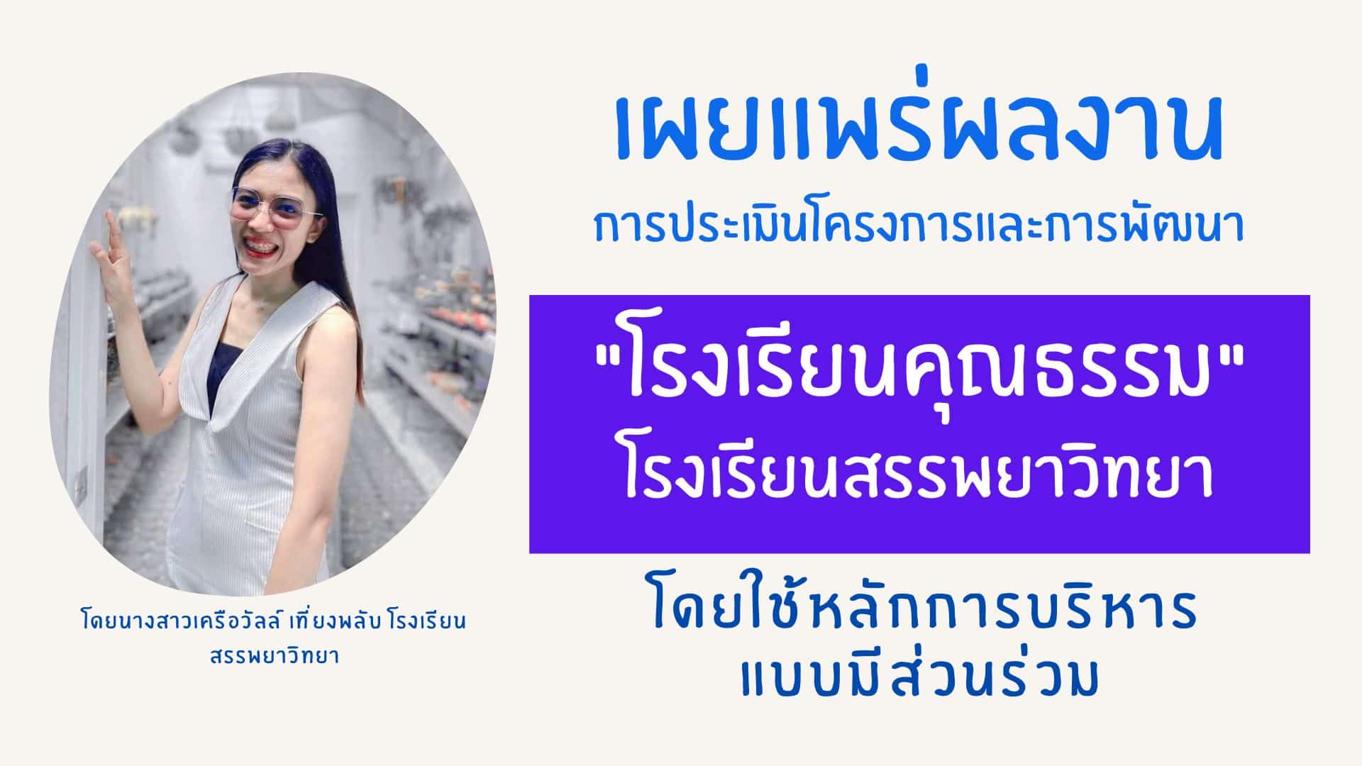 เผยแพร่ผลงาน การประเมินโครงการและการพัฒนา “โรงเรียนคุณธรรม” ของโรงเรียนสรรพยาวิทยา โดยใช้หลักการบริหารแบบมีส่วนร่วม โดยนางสาวเครือวัลล์ เที่ยงพลับ โรงเรียนสรรพยาวิทยา