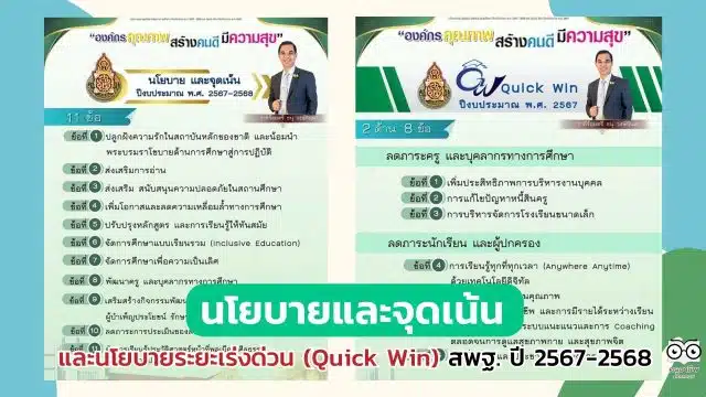 นโยบายและจุดเน้นของสำนักงานคณะกรรมการการศึกษาขั้นพื้นฐาน ประจำปีงบประมาณ พ.ศ. 2567 – 2568และนโยบายระยะเร่งด่วน (Quick Win) ประจำปีงบประมาณ พ.ศ. 2567 นโยบายและจุดเน้น และนโยบายระยะเร่งด่วน (Quick Win) สพฐ. ปีงบประมาณ พ.ศ. 2567-2568