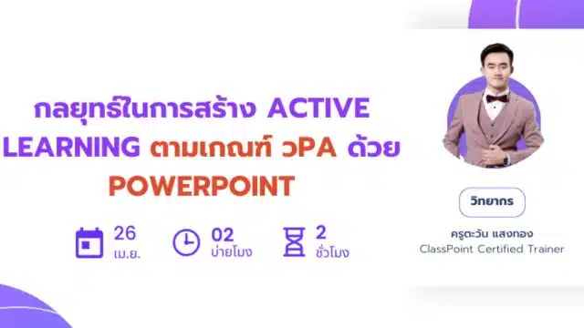 อบรมออนไลน์ฟรี กลยุทธ์ในการสร้าง Active Learning ตามเกณฑ์ วPA ด้วย PowerPoint วันที่ 26 เมษายน 2566 วิทยาการ ครูตะวัน แสงทอง