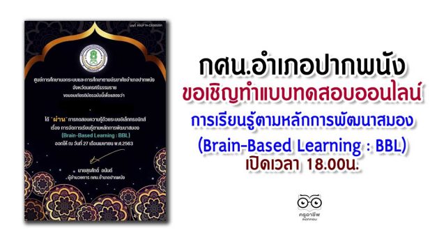 กศน.อำเภอปากพนังขอเชิญทำแบบทดสอบออนไลน์ เรื่อง การเรียนรู้ตามหลักการพัฒนาสมอง (Brain-Based Learning : BBL) เปิดเวลา 18.00น.