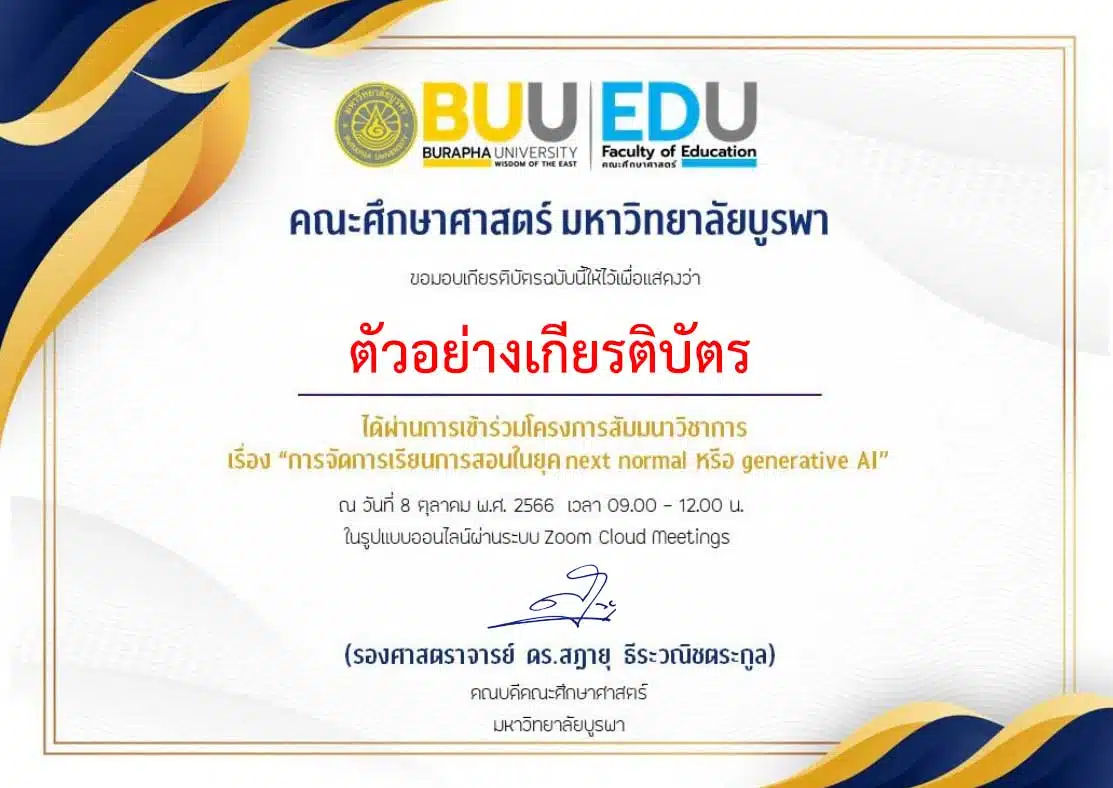 ลิงก์แบบประเมิน รับเกียรติบัตรอบรมออนไลน์ฟรี การจัดการเรียนรู้ในยุค Next Normal หรือ Generative AI ในวันอาทิตย์ที่ 8 ตุลาคม 2566 โดยคณะศึกษาศาสตร์ มหาวิทยาลัยบูรพา