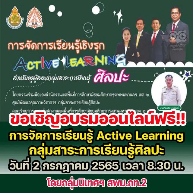 ขอเชิญอบรมออนไลน์ การพัฒนาการจัดการเรียนรู้ Active Learning กลุ่มสาระการเรียนรู้ศิลปะ วันที่ 2 กรกฎาคม 2565 เวลา 8.30 น. โดยกลุ่มนิเทศฯ สพม.กท.2