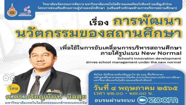 ประชาสัมพันธ์ หลักสูตรศึกษาศาสตรมหาบัณฑิต สาขานวัตกรรมการบริหารการศึกษา วิทยาลัยนวัตกรรมการจัดการ มหาวิทยาลัยเทคโนโลยีราชมงคลรัตนโกสินทร์ ขอเชิญ ลงทะเบียนเข้าร่วมโครงการ “การพัฒนานวัตกรรมของสถานศึกษาเพื่อใช้ในการขับเคลื่อนการบริหารสถานศึกษา ภายใต้รูปแบบ New Normal”