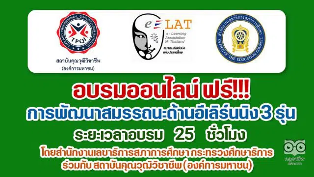 ขอเชิญเข้าร่วมอบรมออนไลน์ ฟรี การพัฒนาสมรรถนะด้านอีเลิร์นนิง รุ่นที่ 1-2-3 ระยะเวลาอบรม 25 ชั่วโมง โดยสำนักงานเลขาธิการสภาการศึกษา กระทรวงศึกษาธิการ ร่วมกับ สถาบันคุณวุฒิวิชาชีพ (องค์การมหาชน)