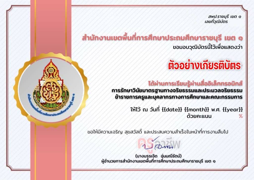 อบรมออนไลน์ หลักสูตร การรักษาวินัย มาตรฐานทางจริยธรรมและประมวลจริยธรรม ผ่านเกณฑ์ 80% รับเกียรติบัตรทางอีเมล โดย สพป.ราชบุรี เขต 1