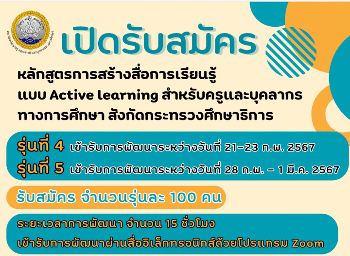ประกาศเปิดรับสมัคร ผู้เข้ารับการพัฒนาโครงการพัฒนาครูและบุคลากรทางการศึกษาสู่ทักษะแห่งอนาคต : หลักสูตรการสร้างสื่อการเรียนรู้แบบ Active learning สำหรับครูและบุคลากรทางการศึกษา สังกัดกระทรวงศึกษาธิการ ผ่านสื่ออิเล็กทรอนิกส์ด้วยโกรม Zoom (ออนไลน์)