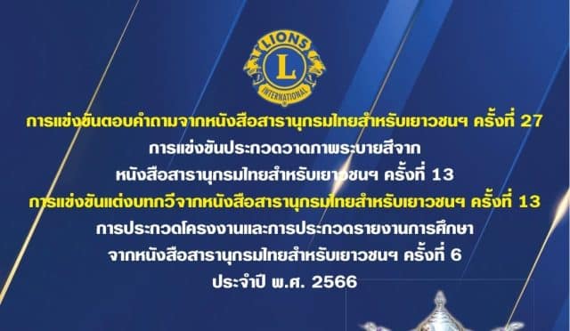 สโมสรไลออนส์สากลภาครวม 310 ประเทศไทย มูลนิธิโครงการสารานุกรมไทยสำหรับเยาวชนฯ สำนักงานคณะกรรมการการศึกษาขั้นพื้นฐาน กระทรวงศึกษาธิการและมูลนิธิไลออนส์ในประเทศไทย จัดการแข่งขันตอบคำถามสารานุกรมไทย สำหรับเยาวชน ครั้งที่ 27 ประจำปี 2566 สามารถศึกษาเกณฑ์ และสมัครร่วมแข่งขันในลิงก์ด้านล่างครับ
