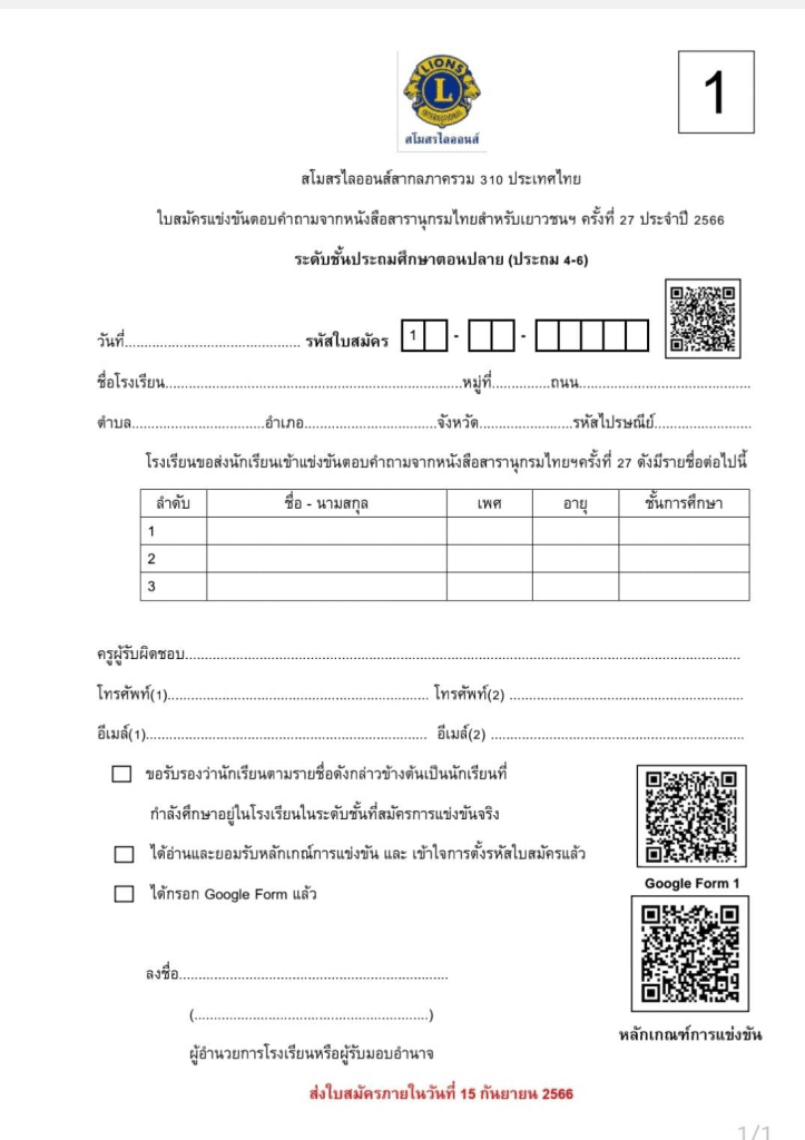 ใบสมัครแข่งขันตอบคำถามจากหนังสือสารานุกรมไทยสำหรับเยาวชนฯ ครั้งที่ 27 ประจำปี 2566 ระดับชั้นมัธยมศึกษาตอนต้น (ม.1- ม.3)