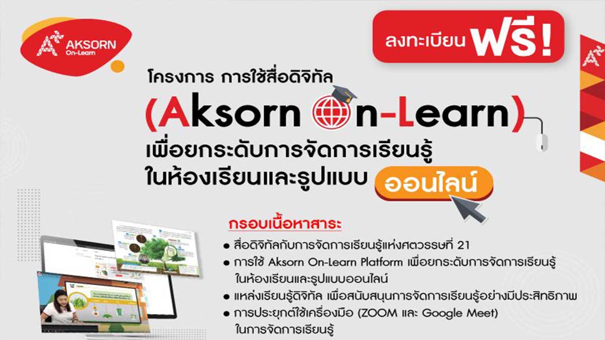 อักษรจัดอบรมออนไลน์ฟรี!! การใช้สื่อดิจิทัล (Aksorn On-Learn) เพื่อยกระดับการจัดการเรียนรู้ในห้องเรียนและรูปแบบออนไลน์ สมัครด่วน จำกัดเพียง 500 ที่นั่ง ต่อหลักสูตร เท่านั้น
